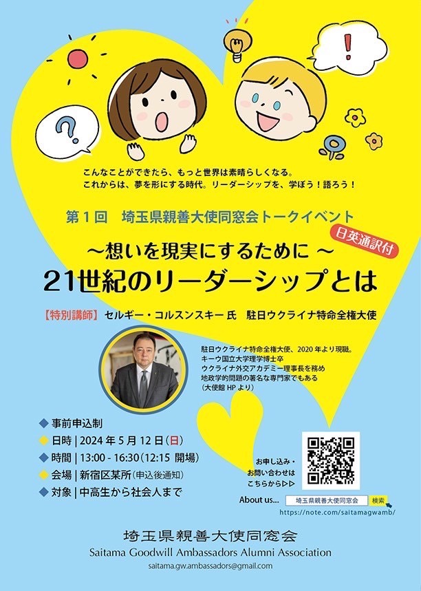 埼玉県親善大使同窓会が、5月12日午後、東京都内にて特別イベントを開催することになりました。セルギー・コルスンスキー駐日ウクライナ特命全権大使をお呼びして、リーダーシップについてお話お伺いします。当日は通訳が入ります。